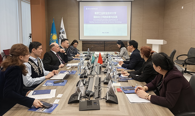 在纳扎尔巴耶夫大学,研究生院首席行政官叶尔肯·图尔甘巴耶夫(Yerken Turganbayev)、国际化处处长阿丽娅·凯莫尔迪诺娃(Aliya Kaimoldinova)、国际化处总经理阿伦·库斯潘诺夫(Alen Kuspanov)、国际化处经理艾格丽姆·扎齐特(Aigerim Zhazit)出席了会议。会上,叶尔肯·图尔甘巴耶夫希望双方围绕科研合作、教师与学生互访项目以及各类培训项目,展开深度探讨,共同探索中哈教育合作新路径,推动两国教育交流与合作迈向新高度,为“丝绸之路经济带”建设注入强劲教育动力。pp电子官网代表团介绍了江苏经济的整体情况、pp电子官网基本情况、国际化工作现状以及“中文+职业技能”教育合作方案。