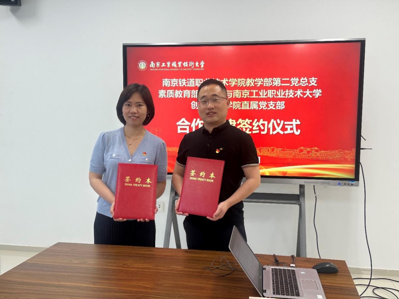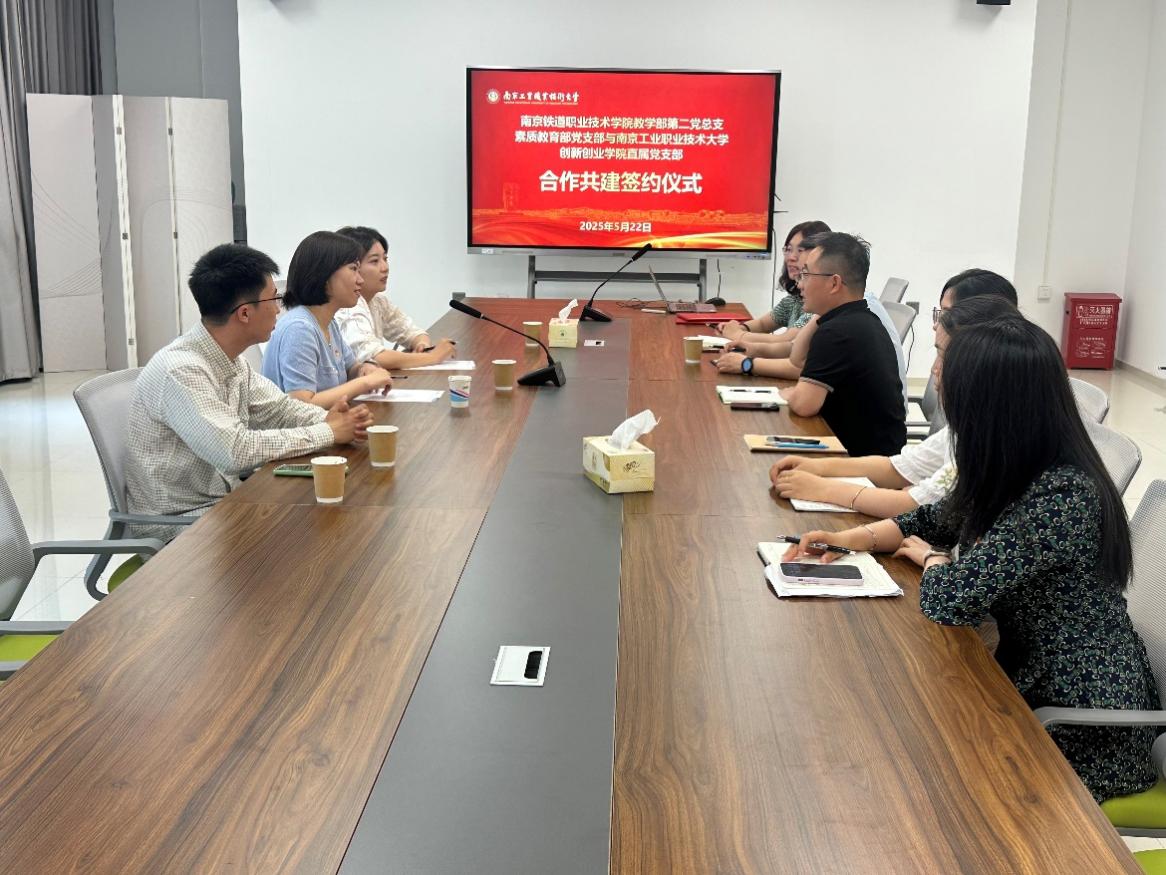 5月22日上午,pp电子官网创新创业学院直属党支部与南京铁道职业技术学院教学部第二党总支素质教育部党支部结对共建签约仪式在仙林校区双创大楼会议室顺利举行。南京铁道职业技术学院教学部第二党总支素质教育部党支部书记、主任孙珏,pp电子官网创新创业学院直属党支部书记、院长纪海波,以及双方支部班子成员和教师代表出席签约仪式。