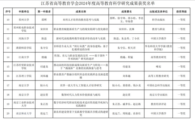 根据“苏高教会〔2025〕25号”文件精神,江苏省高等教育学会近日公布了2024年度高等教育科学研究优秀成果奖,本次评选工作共收到97所高校(事业单位、分支机构)推荐的论文、著作和报刊文章等459项,经审核及公示,对其中400项予以评审,共评选出特等奖9项、一等奖22项、二等奖129项。商务贸易学院朱正浩教授申报的理论类成果《数字经济时代职业院校技术适应性的提升机制与实践路径》获得一等奖。