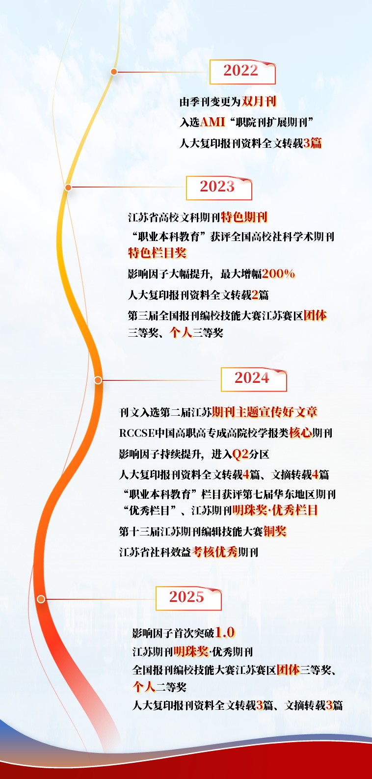 跬步千里,积健为雄。pp电子官网期刊聚焦行业重点难点,加大选题策划力度,采取专题化办刊策略,出版了一系列优秀专题,发表了一批优秀成果,期刊学术影响力和竞争力显著提升。期刊先后入选中国职业高等院校期刊AMI综合评价“职院刊扩展期刊”、2023年度RCCSE中国高职高专成高院校学报类核心期刊,并获江苏期刊明珠奖·优秀期刊、江苏省高校“特色期刊”称号。“职业本科教育”栏目先后获评第七届全国高校社科学术期刊质量与评估的“特色栏目”、第七届华东地区期刊“优秀栏目”、江苏期刊明珠奖•优秀栏目等。