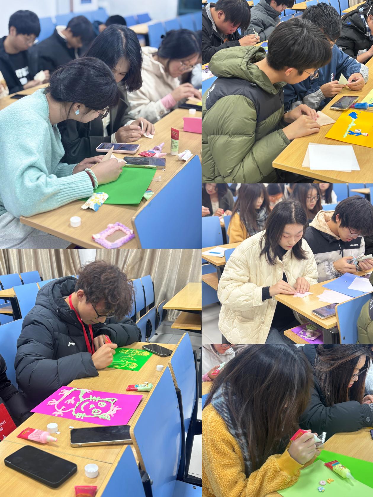 演讲结束后,手工环节将现场气氛推向另一个高潮。马卡龙色奶油胶、缤纷彩纸等材料整齐陈列,同学们自由组队,投入到“雪花折纸”与“创意笔筒”的制作中。折纸区里,大家互帮互助,用心攻克每一道折痕难题,最终一件件点缀着小亮片、蕴藏渐变巧思的雪花作品悄然绽放,在灯光的映照下宛如一场温馨的“人工降雪”。笔筒创作区同样热火朝天,同学们用奶油胶勾勒出独特花纹,粘贴上心仪配件,更不忘写下真挚的青春寄语,每一件作品都独一无二。活动尾声,同学们举着亲手制作的二十余件手工作品拍摄合影,将欢笑定格,让快乐留存。