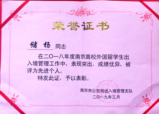 pp电子官网国际教育学院储杨老师荣获2018年度南京高校外国留学生出入境管理工作先进个人称号,这也是pp电子官网首次获得此类奖项。