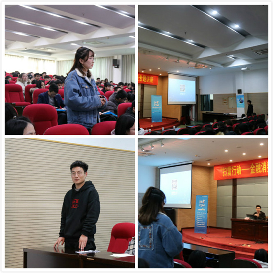 活动邀请到国家互联网金融安全媒体讲师团成员、中国青年报社官微运营室主任李丽、支付宝扫雷行动专业讲师周晨晨做专题主讲。李丽主任介绍了近几个月震惊全国的互联网O2O公司“健康猫”集资诈骗案例,如何通过时髦的创业概念、受骗教师成为“传声筒”、相关媒体传播、有线下业务等“四招”,使教师和学生“入套”,借钱“投资”,同时提醒大家不要贪图小便宜,对“圈子”“熟人”也要保持警惕。周晨晨老师为大学生总结八不“扫雷妙招”,即不要拿养老钱去投资;不要借钱投资和理财;不要看别人赚钱就盲目跟进;不要外借证件,不要乱签合同;电话、QQ、微信等不要轻信他人身份;不要透露密码、验证码,不乱点链接;不要“拆东墙补西墙”,债滚债更还不起;不要投资自己都不懂的项目。与此同时,现场还进行了互动交流环节,两位老师在结合各自领域多年从业经验,就同学们关心的热点问题答疑解惑。
