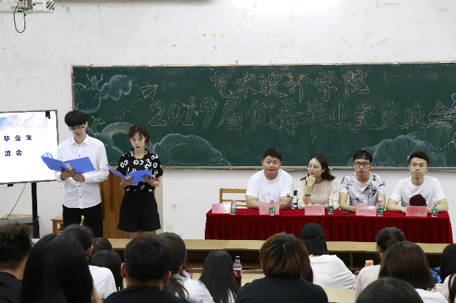 周诗尧同学首先发言,她向大家讲述了在艺术设计学院三年的学习和竞赛经验,勉励同学们在任何时候都要脚踏实地、戒骄戒躁、虚心进取;夏俊杰同学讲述了他的入伍经历和复学生活,告诉大家要珍惜时间、努力学习,做事情要有目标有规划,良好的计划性会让同学们的大学生活更加有意义;栾森同学将他在学生会的工作心得真诚地分享给大家,他告诉同学们,机会是留给有准备的人的,努力学习、积极参加各项比赛和活动,付出总有回报;刘玉同学分析了当下的就业现状,在求职就业方面给同学们提了许多中肯的建议。