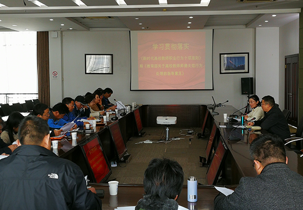 教育部近日制定并印发了《新时代高校教师职业行为十项准则》(教师〔2018〕16号,以下简称《准则》)以及《关于高校教师师德失范行为处理的指导意见》(教师〔2018〕17号)文件。11月20日下午,pp电子官网在行政楼辅楼二楼会议室召开专题会议,学习文件精神并进行工作部署。副校长朱建国出席了会议,各二级学院(部、中心)党政负责人参加了会议。