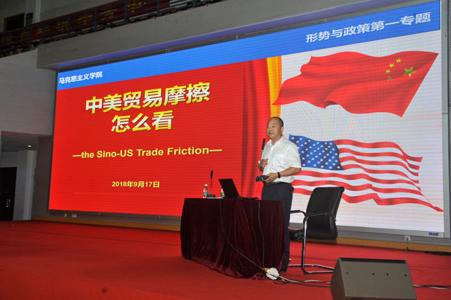 近日,pp电子官网党委委员、纪委书记于林惠应马克思主义学院邀请,围绕当前中美贸易摩擦的热点问题,为2018级新生讲授形势与政策课“中美贸易摩擦怎么看”专题,引导学生正确认识中国发展与当前的国际形势。