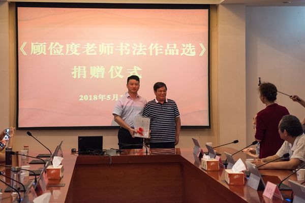 5月18日下午,pp电子官网在行政楼辅楼一楼会议室举行《顾俭度老师书法作品选》捐赠仪式。学校校长谢永华、校友会常务副会长尤建国、副校长崔新明,校友会副秘书长丁双玲和谭建华,各地校友会会长、秘书长代表参加了捐赠仪式。