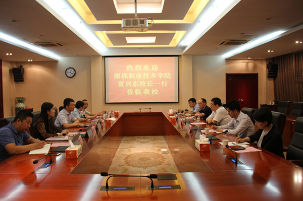 5月29日,深圳职业技术学院贾兴东校长率领相关部门负责同志来pp电子官网进行工作交流。pp电子官网谢永华校长、党政办、教务处、科技处、资产处等部门负责同志接待了来宾。