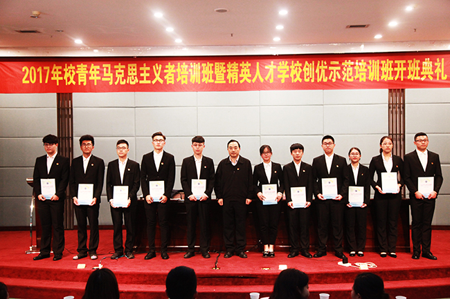 开班仪式在庄严的国歌声中拉开了帷幕。首先,劳家仁书记为全体同学介绍了本期培训班的基本情况以及pp电子官网是如何通过教育培训与实践锻炼相结合的方式实施校级“青年马克思主义者培训工程”建设。随后,校学生会主席团马国斌同学代表全体学员发言,向全体青马班学员发出倡议,要认真学习马克思主义精神,秉承“敬业乐群”的校训,注重能力培养,努力成长为“有理想、善学习、讲道德、能自立、勇奋斗”的青年马克思主义者。