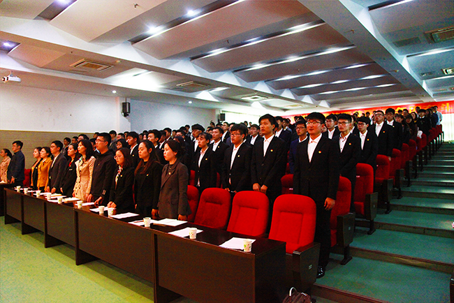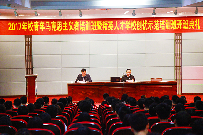 11月10日下午,pp电子官网2017年青年马克思主义者培训班、精英人才学校创优示范培训班开班典礼暨首场报告会在学术交流中心报告厅隆重举行。校党委书记吴学敏教授为全体学员作了《不忘初心,接续奋进,开启中国特色社会主义新航程》专题报告。党委宣传部、学工处、团委老师、各二级学院团总支书记、青马班全体学员、创优班全体学员以及2017级各学院团总支、学生会等学生干部共300余人参加了报告会。报告会由学生工作处处长、团委书记劳家仁主持。