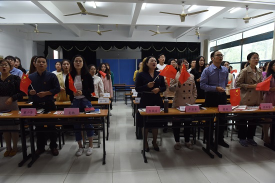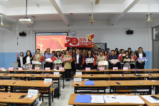 本次活动共分为五个环节:第一个环节,值此新中国成立70周年之际,为表达师生对伟大祖国的热爱,由党员教师代表马刚、沈秀梅、严潇睿三位老师与5位学生代表一起朗诵了《从我心底深爱我的祖国》,师生们用最深情的声音表达对祖国的热爱。第二个环节,党员教师以“初心是什么,使命干什么,奋斗比什么”为专题,每个人结合自己的岗位阐述了如何践行他们所守的教师初心。樊群老师的“爱校如家”、张家颖老师的“师生情谊爱相连”、张莹老师的“立德树人”、夏楠老师的“学高为师,身正为范”、戴小清老师的“培养有理想有追求有担当的大学生”、马刚老师的“敬业乐群”、沈秀梅老师的“爱生如子”、严潇睿老师的“以学生为本、开启心灵之门”、张芹老师的“师者,传道授业解惑”和李国彦老师的“信任、宽容、欣赏、创造”等等都是各位老师对于自己教育事业初心的总结和归纳。陈林杰书记也给大家分享了他的初心、使命和奋斗目标。同时也告诫大家工作不能只停留在口号上,一定要在工作中努力践行,为国家培养更多高技能人才。第三个环节,猜红歌比赛。党员教师和学生共分为五组,由主持人现场随机播放18首红色歌曲,现场选手抢答歌曲名称正确即而得分,最后根据每组累计得分评选出了一二三等奖。第四个环节,全体师生励志报效祖国。全体师生分别在彩色便签纸上写下了自己将如何通过实际行动来回报祖国母亲,并将自己立下的誓言贴到了中国地图上的每个角落。第五个环节,全体师生高声齐唱《我和我的祖国》。大家手握鲜艳的五星红旗,通过热情洋溢的歌声,表达了大家对祖国母亲的热爱和祝福,同时也将现场活动氛围推向了最高潮。