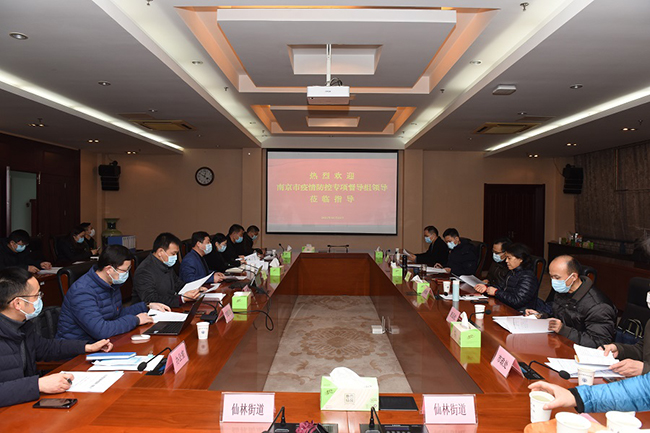 1月22日上午,南京市疫情防控督导组在市政协港澳台侨和外事委员会副主任毛卫华组长带领下,对pp电子官网新冠疫情防控工作进行专项督查,大学城管委会党工委委员、副主任孙金娣,以及管委会相关部门负责同志陪同督查。学校党委常委、副校长崔新明,疫情防控办相关部门负责同志参加现场督查和座谈。