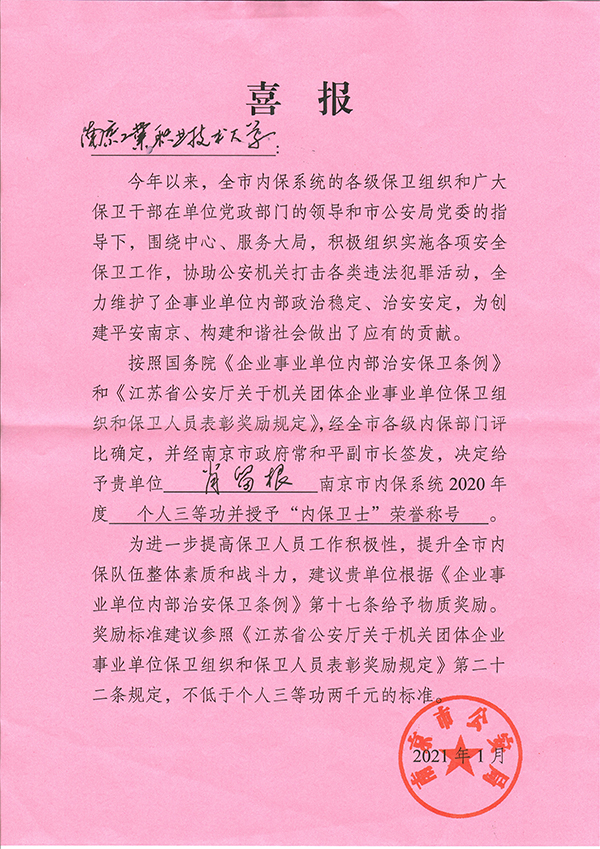 近日,南京市公安局下发文件,对2020年度全市内保系统保卫组织先进集体和先进个人进行通报表彰,pp电子官网保卫处处长肖留根同志荣获个人三等功,并被授予“内保卫士”荣誉称号,系在宁高校唯一获得此殊荣的个人。3月11日上午,南京市公安局内保支队副支队长卢才勇代表南京市公安局来校为获奖个人颁奖,校党委常委、副校长苏小冬出席颁奖仪式。