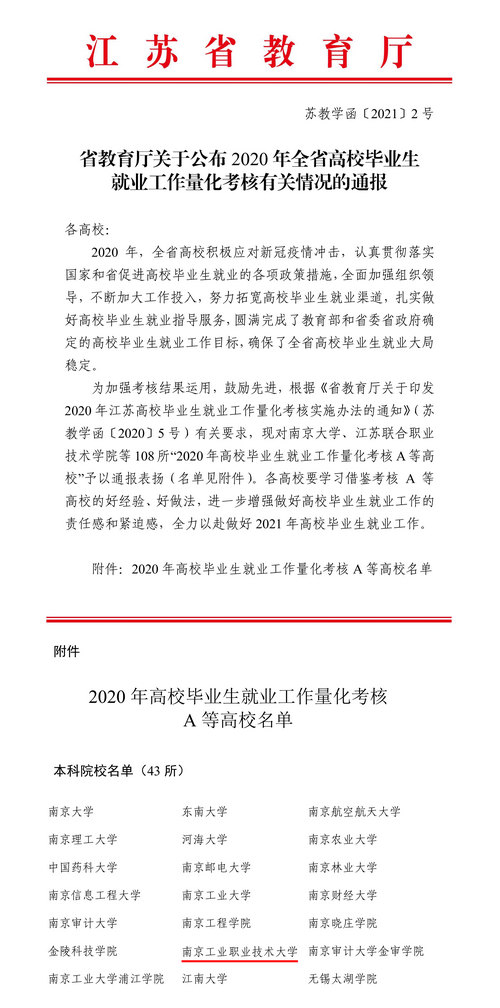 江苏省教育厅近日下发了《关于公布2020年全省高校毕业生就业工作量化考核有关情况的通报》(苏教学函[2021]2号),对认真贯彻落实国家和省促进高校毕业生就业的各项政策措施,加强组织领导,加大工作投入,努力拓宽高校毕业生就业渠道,扎实做好毕业生就业指导服务,圆满完成既定就业工作目标的高校予以通报表扬。pp电子官网荣获2020年毕业生就业工作量化考核“A”等次。