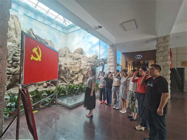 随后,来到茅山新四军纪念馆,该纪念馆于1985年9月建成并对外开放,是全国爱国主义教育示范基地。支部党员首先在党旗下重温了入党誓词,随后全体人员先后参观了“苏南新四军抗日斗争基本陈列”“苏南新四军将帅陈列”“新四军廉政建设史实展”“茅山新四军英烈馆”和“新四军先遣支队暨韦岗战斗历史陈列”。在讲解员的细致讲解下,通过观看大量珍贵文物和历史资料,大家共同追忆新四军与苏南人民浴血奋战的烽火岁月,同时也学习到新四军如何在极其困难的环境下,靠着智慧和勇气,严明自身纪律,团结广大群众,发扬创新精神,勇于创业,建立抗日根据地,在抗日斗争中发挥重要作用。