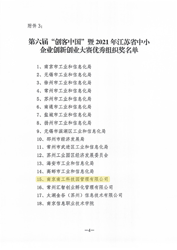 近日,第六届“创客中国”暨2021年江苏省中小企业创新创业大赛顺利落下帷幕,江苏省工业和信息化厅综合各市宣传发动、报名组织、参赛人数、承办赛事等情况,评选了大赛优秀组织奖,pp电子官网大学科技园运营公司——南京南工科技园管理有限公司名列其中。