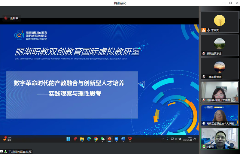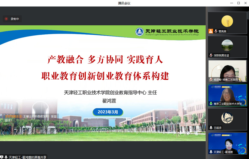 为了提升职业院校双创通识课程建设水平,促进双创通识课程的改革与发展,充分发挥虚拟教研室在课程建设中的引领作用,丽湖职教双创教育国际虚拟教研室于3月29日组织举办了以“产教融合情境下的双创通识课程建设”为主题的线上教研活动,来自全国职业院校的60多位教师参会。本次活动由pp电子官网创新创业学院和天津轻工职业技术学院创业教育中心共同承办,pp电子官网创新创业学院副院长张秀芹主持了教研活动。