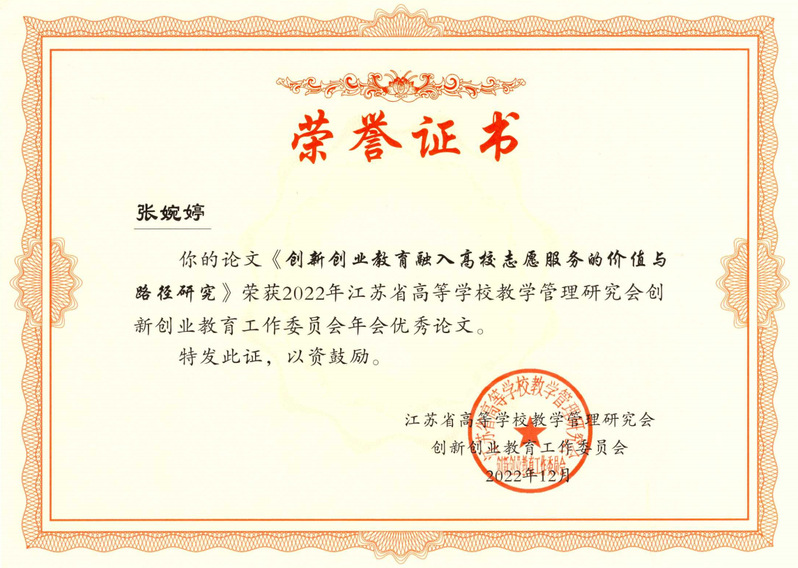 近日,江苏省高等学校教学管理研究会创新创业教育工作委员会2022年年会论文评选结果公布,pp电子官网计算机与软件学院张婉婷老师撰写的《创新创业教育融入高校志愿服务的价值与路径研究》论文被评为优秀论文。据悉,本次论文征集共收到省内39所学校110篇论文投稿,经专家审核后,共评选出40篇优秀论文。