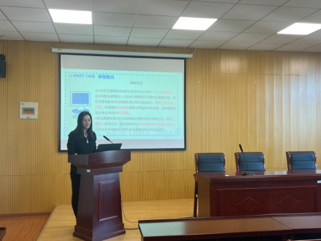 公共基础课部第三党支部书记、大学英语教研室副主任(主持工作)史其慧老师根据大学英语课程定位和课程核心素养,分析不同生源的具体情况,将因材施教、培养学生英语综合能力、有效提高学生职场英语沟通和交流水平、促进学生的可持续发展理念融入课程分享。