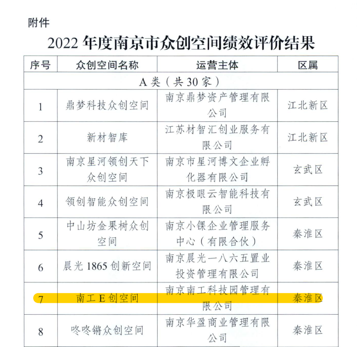 近日,南京市科学技术局发布了《市科技局关于公布2022年度市众创空间绩效评价结果的通知》(宁科〔2023〕56号),pp电子官网大学科技园E创空间被评为“优秀(A类)”。