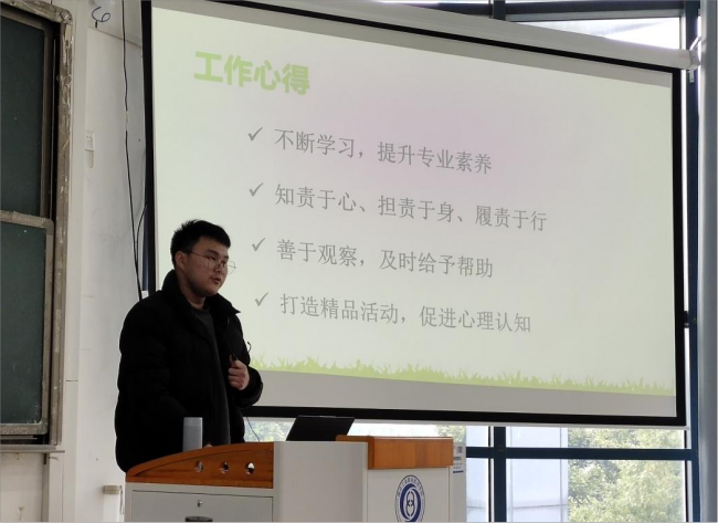 心理委员代表、2023年仙林大学城优秀心理委员张缪翔分享了自己作为朋辈心理工作者的经历和感悟。他以自己在任期间举办的各项活动和取得的阶段性成果为例,分享了对朋辈心理工作者职责的理解:要始终保持一颗热爱心理工作的初心,要有强烈的责任感,要善于沟通懂得协作,以举办各项心理活动为契机,提升同学们对自己心理健康的关心关爱水平。