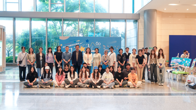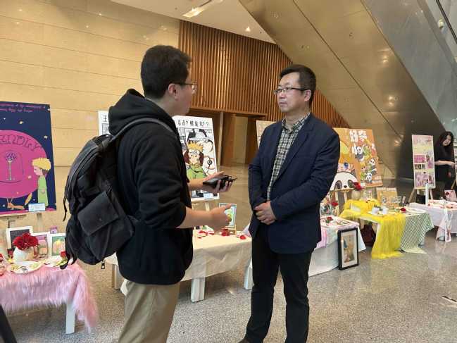 王一仔细听取了学生的介绍,对视觉传达系学生的设计作品给予了高度评价,她指出,学生的主题IP设计创作围绕中法两国文化主题,贴近年轻群体生活,创意性强,不少作品具备市场价值。