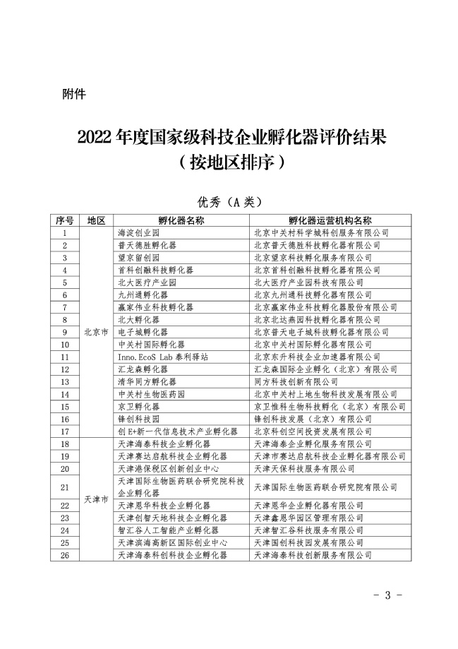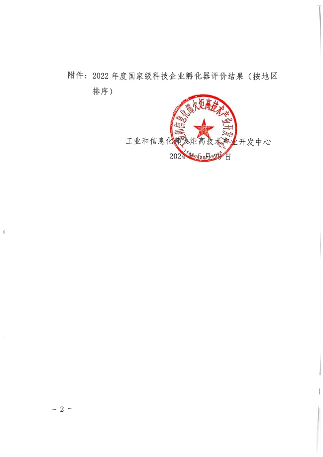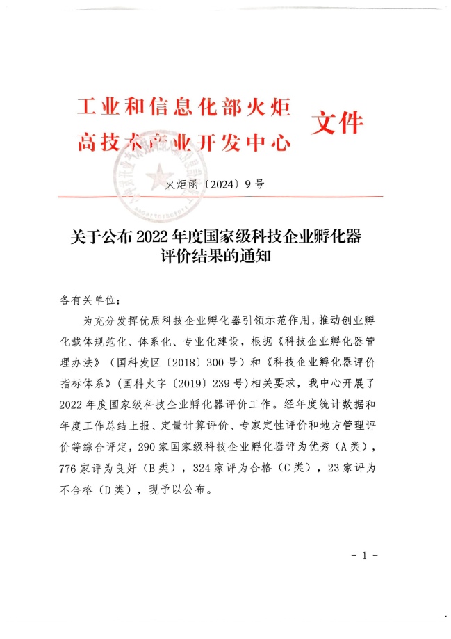 近日,工业和信息化部火炬高技术产业开发中心发布了《关于公布2022年度国家级科技企业孵化器评价结果的通知》(火炬函〔2024〕9号),此次评价中共有290家国家级科技企业孵化器被评为优秀(A类),776家被评为良好(B类),324家被评为合格(C类),23家被评为不合格(D类),其中pp电子游戏官网科技园被评为“优秀(A类)”。