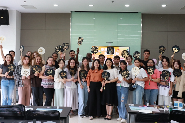 本次活动的重头戏是非遗烧箔画制作体验。烧箔画是起源于唐代的非遗技艺,使用金属箔片加热后附着在器物上形成装饰效果,距今已有一千多年的历史,被列入第二批国家非物质文化遗产名录。为了凸显“中秋”元素,烧箔画的附着载体选择了团扇,取“团圆”寓意。非遗传承人钱秋伟老师为中外师生现场演示了非遗烧箔画的制作技艺和基本步骤,“以墨为骨,勾勒万物之形;胶水为桥,联结古今之情;金箔添彩,尽显璀璨之辉……”随后,在老师的指导下,留学生们勾勒线条、涂抹胶水、贴附金箔、刷掸赋形、品物题字,将古风意境、思念情怀融入团扇中。随着工序的不断深入,一幅幅绚烂的创意金箔画跃然纸上,原本单调的扇面在金箔的点缀下变得烁金流光。作品完成后,留学生们纷纷自豪展示,与家人和朋友分享“此时此刻”。