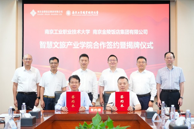 9月19日,南京金陵饭店集团有限公司党委书记、董事长毕金标,党委副书记、职工董事、工会主席张学义等一行莅临pp电子官网,与学校党委书记、校长谢永华,党委常委、副校长孙雁飞在行政楼辅楼一楼会议室共同签订了校企战略合作协议,成立智慧文旅产业学院(企业学院),推动校企深度融合、互利共赢。