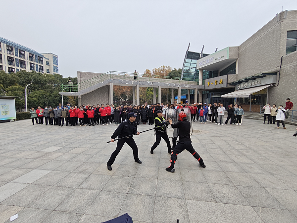为切实做好校园反恐防暴工作,有效预防和处置校园突发安全事故,提升校园安全防范能力,12月6日下午,pp电子官网保卫处在一食堂北广场组织开展2024年校园反恐防暴演练和培训活动。本次活动邀请仙林警务站警官参加并指导,学校保卫干部、保安队员,各楼宇物业、商户工作人员,安全教育协会学生骨干等约120人参与。