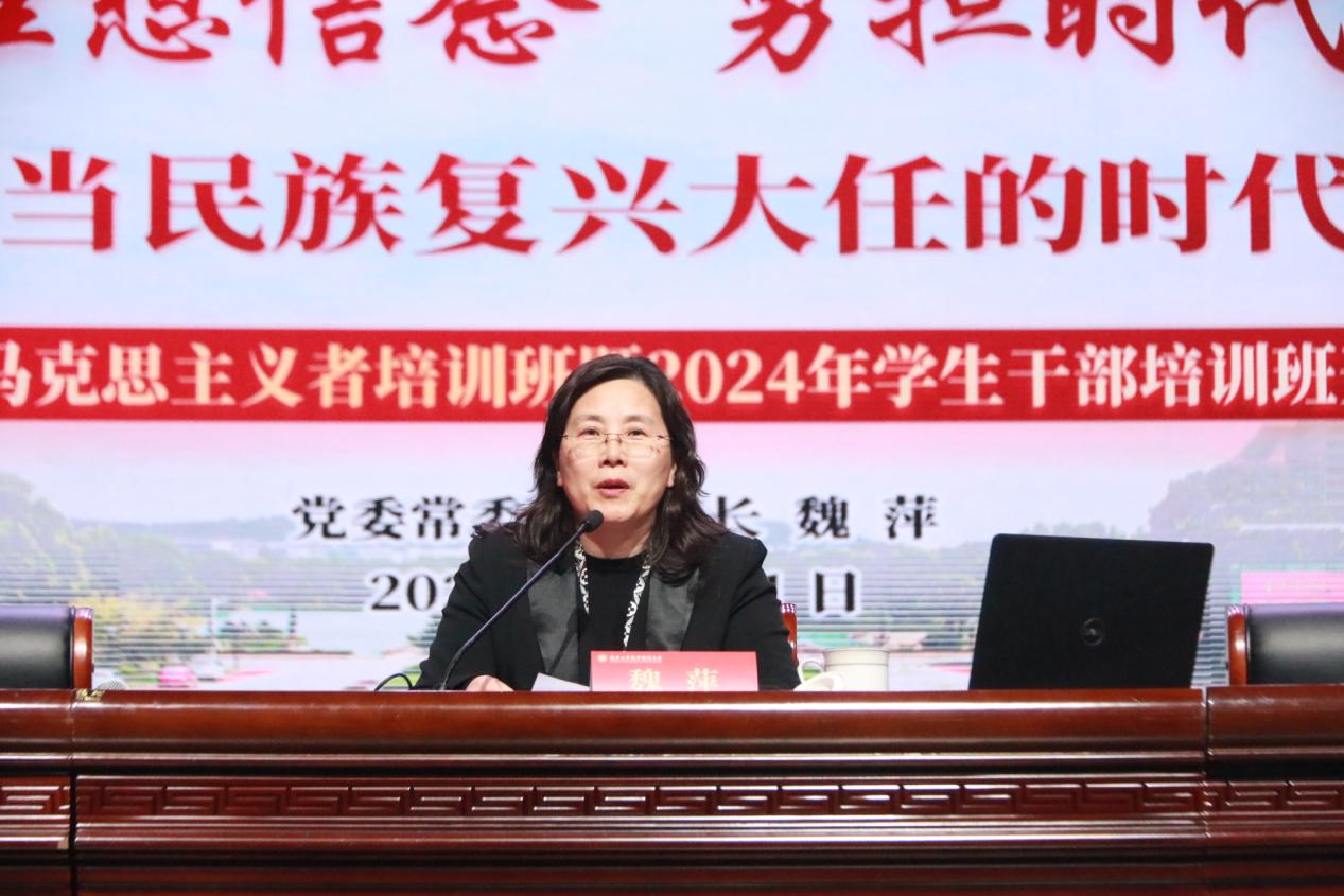 开班仪式上,魏萍以《坚定理想信念 勇担时代使命 争做堪当民族复兴大任的时代新人》为题为培训班全体学员讲授开班第一课。她指出,以习近平同志为核心的党中央高度重视青年、热情关怀青年、充分信任青年、热切瞩望青年,广大学生干部应牢记习近平总书记的谆谆教诲和殷殷嘱托,争做堪当民族复兴大任的时代新人。她结合学校百年历史发展,从学校创始人黄炎培到革命烈士江竹筠,从中国工程院院士顾心怿到全国青年岗位能手王美健,通过一个个优秀校友典型示例,详细阐释了新时代南工青年的使命与责任,同时,对全体学生干部提出期望:一是生逢其时前景广阔,南工青年应树立远大理想;二是百年传承薪火相继,南工青年应勇担时代使命;三是勇担试点示范使命,南工青年应争做时代新人;四是担当学生干部职责,南工青年应走在前做示范。